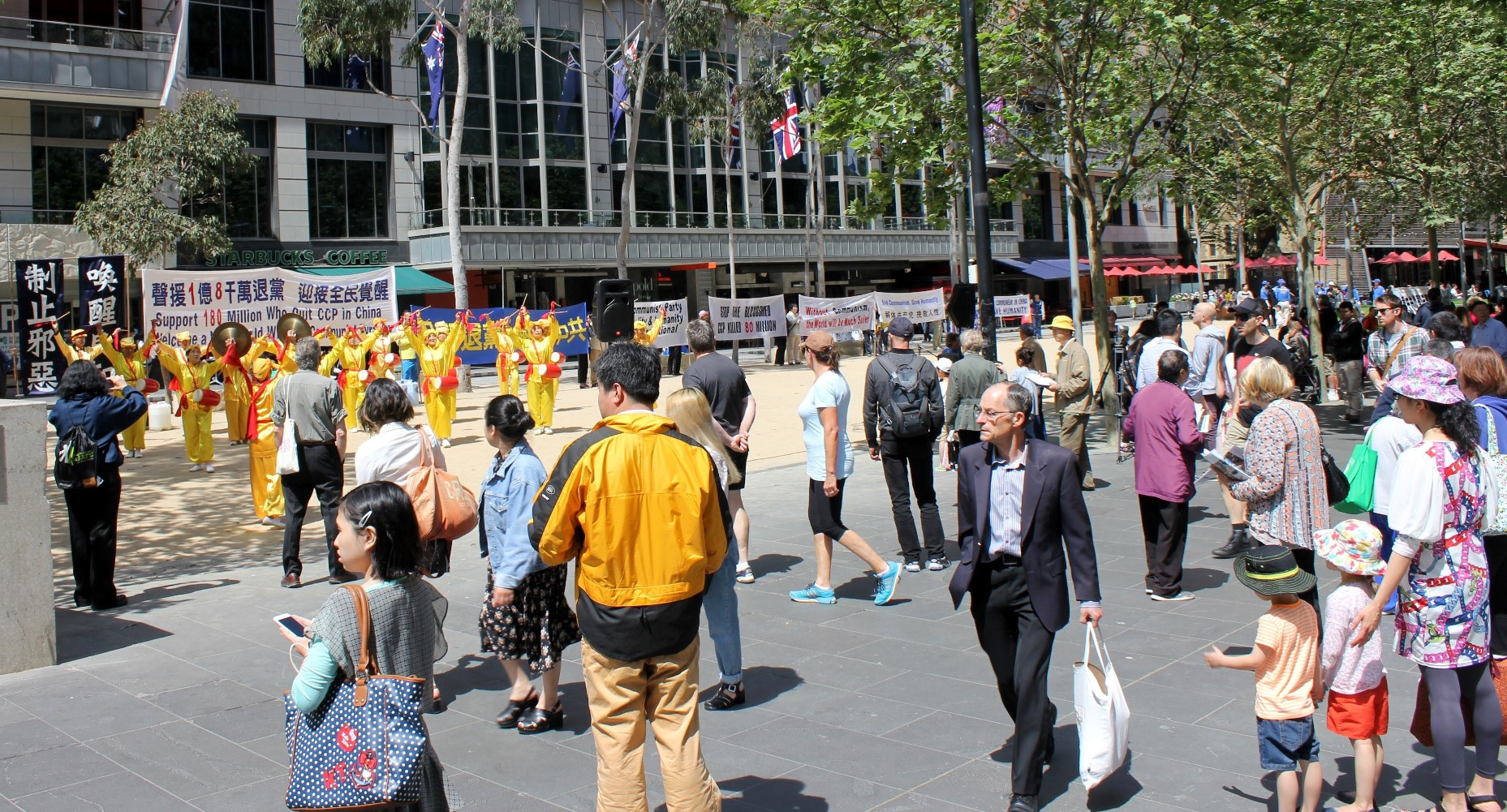 ![]() 墨尔本市民和游客被声援三退集会上的发言和表演深深吸引 |