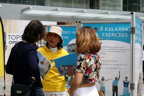 一名印尼裔的女士签名后留下了电子邮件地址,再三嘱咐学员一定要给她发邮件告诉她更多细节。她表示,如果法轮功学员需要帮助,随时都可以联络她,她一定会来。一名来自中国大陆的留学生了解真相后声明退出了共青团和少先队。