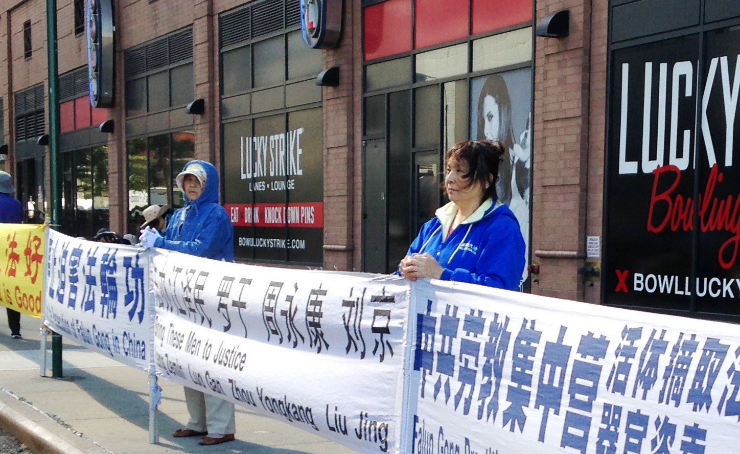 ![]() 高蓉蓉的姐姐高薇薇(图中右一)在中领馆前抗议中共对法轮功学员的迫害和对妹妹高蓉蓉的虐杀 |