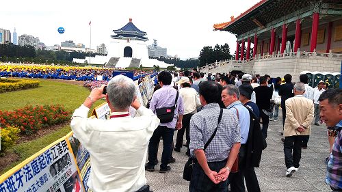 ![]() 图1-3:自由广场前法轮功学员举办的大型排字弘法活动,吸引台湾民众及外国观光客驻足观看 |