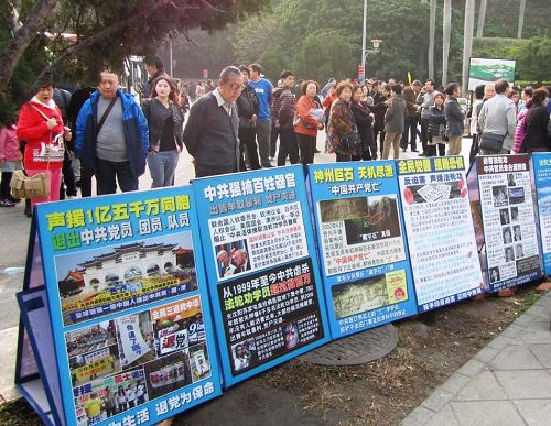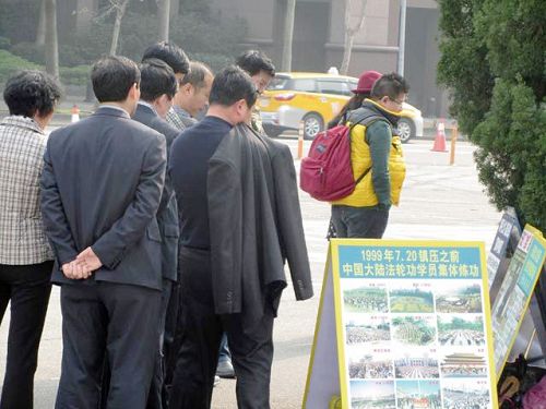 【明慧网二零一四年十一月十七日】(明慧记者郑语焉台湾台北采访报导)自从海峡两岸开放观光以来,台湾许多著名景点成为大陆观光客的热门去处,法轮功学员在景点摆置展板、发放资料,向大陆游客讲清真相、劝三退(退出中共党、团、队组织)。