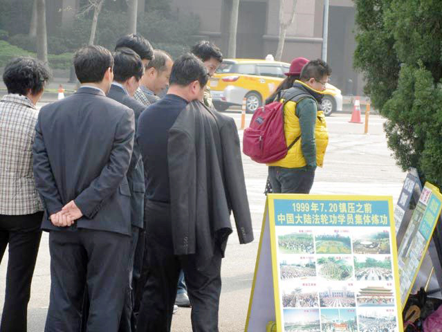 另一位轮值的学员早将展板整齐摆列好,展板面前挤满了大陆游客听、看真相,导游说:我知道飓风天故宫休馆,可是这些旅客都是今天晚上就要搭机离台,他们要求无论如何也要到故宫拍个照也好。这天,这两位学员忙得不可开交,转眼间就协助三十几位大陆游客办了三退。