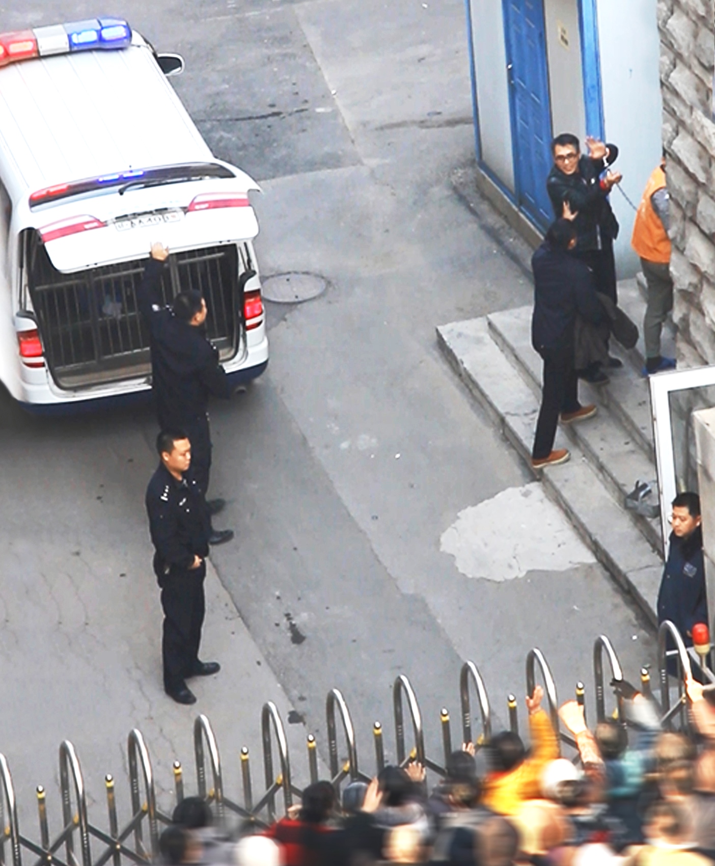 ![]() 图2:于溟在进入法庭前,面带微笑向围观人群挥手并高喊 “法轮大法好”。院子中的几名警察表情木然。 |