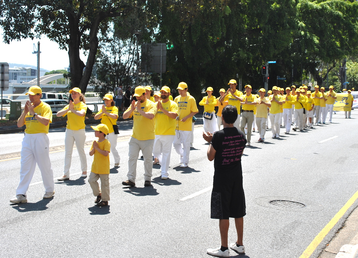 观看游行时不断为法轮功学员鼓掌的澳洲原住民达伦•威廉斯(Daren Williams)表示,七年前他在悉尼为原住民争取权益而绝食时,遇到了同样在和平抗议的法轮功学员,多年来,法轮功给他的印象是“真诚、善良、与人分享爱及和平”。他表示对法轮功学员非常支持,也衷心祝愿他们反迫害的声音可以传遍世界,早日结束这场非人的迫害。 他说:“中共压迫你们,杀害你们的人民,盗取你们的器官,抢占你们的土地,剥夺你们所有的权利,中共根本不在乎你们和中国人民,拿走你们的一切,所以你们必须告诉全世界。我们和你们同在,我们会一起对抗,拒绝让你们的人民再受到不公正及邪恶的对待。”