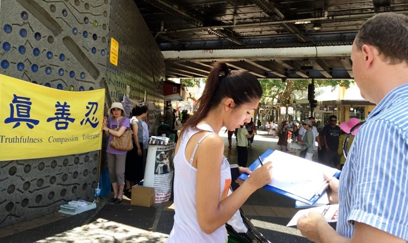 【明慧网二零一四年十一月二十七日】(明慧记者华清悉尼报道)“为了让更多的人了解法轮功真相,共同制止迫害,站在那么大的太阳底下根本不算啥!”七十岁的王校芳女士在四十多度高温酷暑下手举法轮功真相横幅站了三个多小时后,依然神色坚定地说。