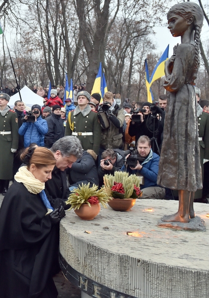 二零一四年十一月二十二日,乌克兰总统波罗申科偕夫人跪祭在苏联共产党制造的“大饥荒”中所死去的数百万国人。这是乌克兰第一次以国家的名义公开反思共产党制造的悲剧,波罗申科总统表示共产党现已被扔进“历史的垃圾堆”。
