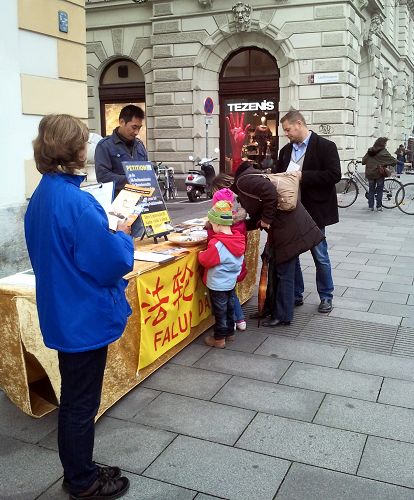 二零一四年十月二十五日,法轮功学员在奥地利格拉茨(GRAZ)市中心举行征签活动,揭露中共活体摘取法轮功学员器官的暴行。