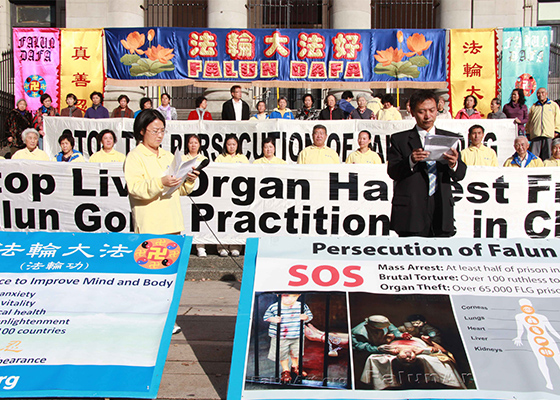 二零一四年十一月四日下午,在加拿大总理哈珀出访中国参加APEC会议前,温哥华法轮功学员在市中心的艺术馆前举行集会,呼吁哈珀总理在出访中国时,公开敦促中共当局停止迫害法轮功,释放所有被非法关押的法轮功学员。