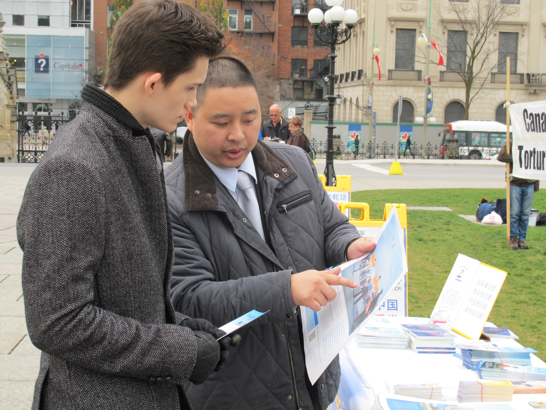 ![]() 加拿大国会山前,法轮功学员给路人讲述发生在中国的迫害事实 |