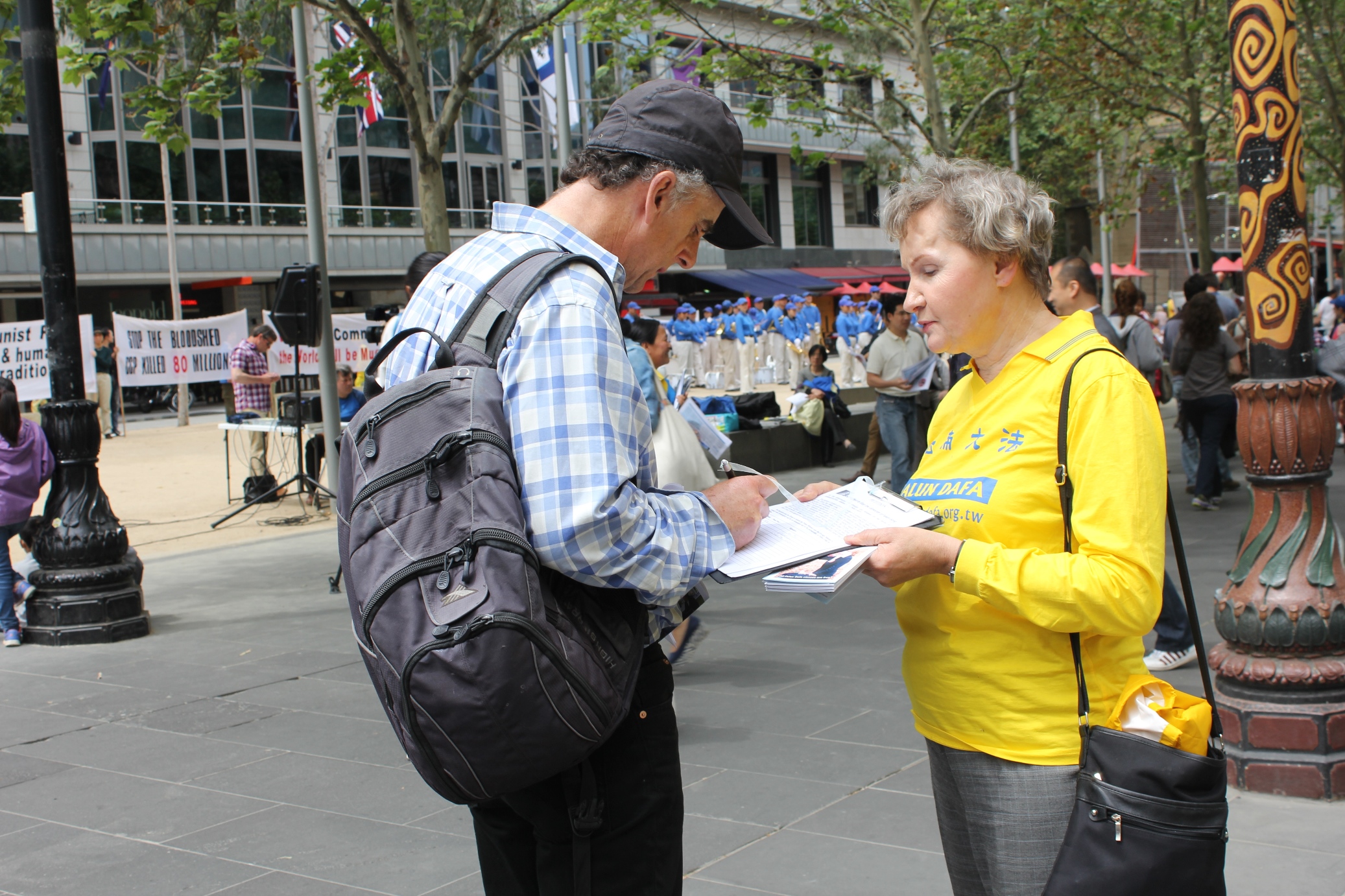 ![]() 澳洲波兰裔画家芭芭拉•沙费尔(右)为制止中共迫害法轮功征集签名 |