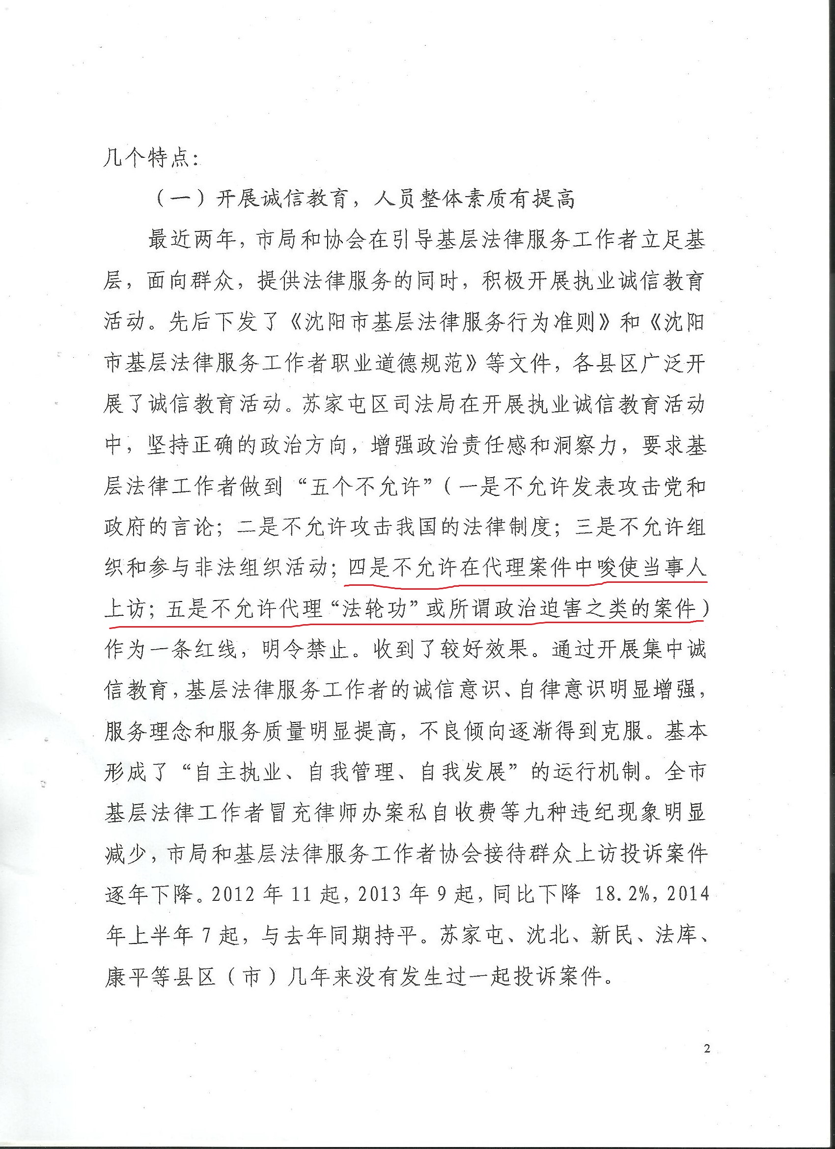 近日,辽宁省沈阳市司法局发布“关于全市基层法律服务所检查情况的通报”,文件中提到“一条红线,明令禁止”的五条内容,其中第五条:不允许代理法轮功或所谓政治迫害之类的案件。第四条是不允许在代理案件中叫人上访。