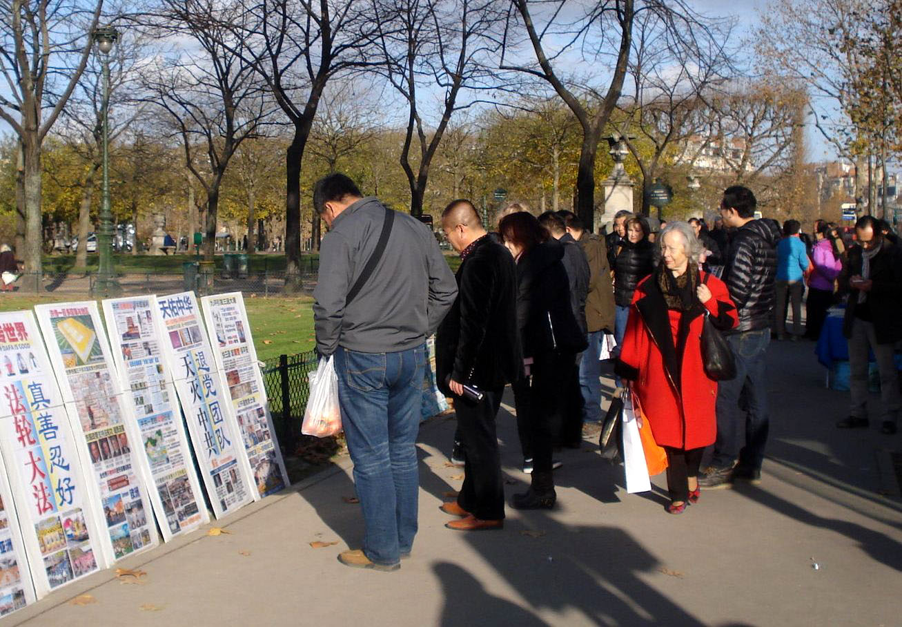 ![]() 图1-3:成群结队的中国游客路过巴黎铁塔下的法轮功真相点 |