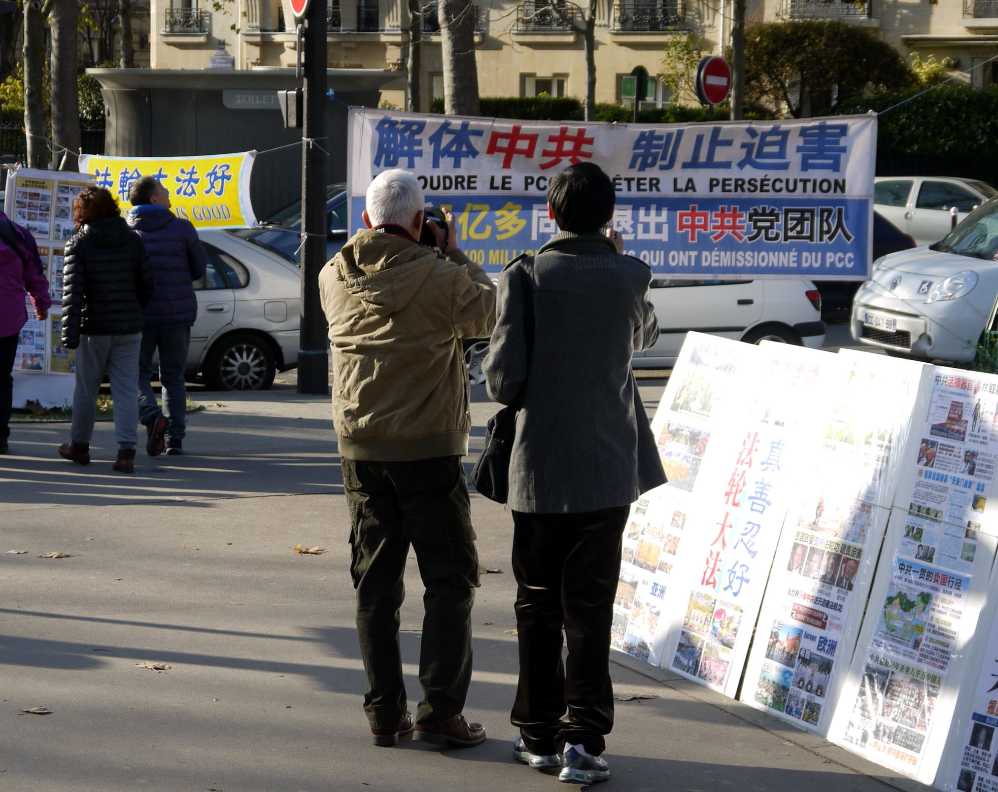 有一个老先生是随团旅游的,遇见法轮功学员,前后左右看着不说话,跟着团最后一个进去。大约半个钟头后,他迅速地从门里出来对小文说:“你给我一张报纸吧。刚才好多人,我担心里边有特务,有人看到。”小文递给他报纸,问他办三退没有,他说:“共产党太坏了,我们在中国大陆体制内的,非常了解。”又说:“非常感谢你们,谢谢你们这样的坚持。”小文给他办了三退,他点头谢过小文后很快又进去了。