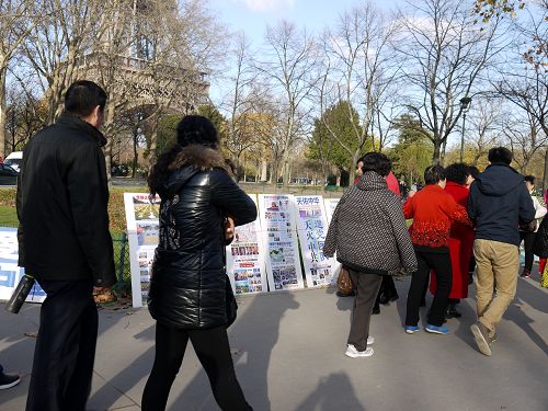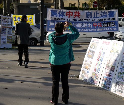 有一个老先生是随团旅游的,遇见法轮功学员,前后左右看着不说话,跟着团最后一个进去。大约半个钟头后,他迅速地从门里出来对小文说:“你给我一张报纸吧。刚才好多人,我担心里边有特务,有人看到。”小文递给他报纸,问他办三退没有,他说:“共产党太坏了,我们在中国大陆体制内的,非常了解。”又说:“非常感谢你们,谢谢你们这样的坚持。”小文给他办了三退,他点头谢过小文后很快又进去了。