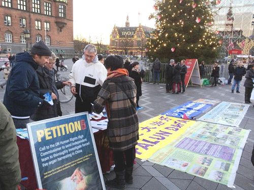 在二零一四年世界人权日前后两周的周六,法轮功学员在丹麦哥本哈根市政厅广场举行活动,向民众讲述中共对法轮功长达十五年的残酷迫害,并征集签名,制止中共强摘器官的暴行。