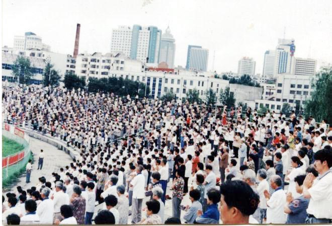 ![]() 一九九九年七月前,哈尔滨法轮功学员集体炼功场面 |