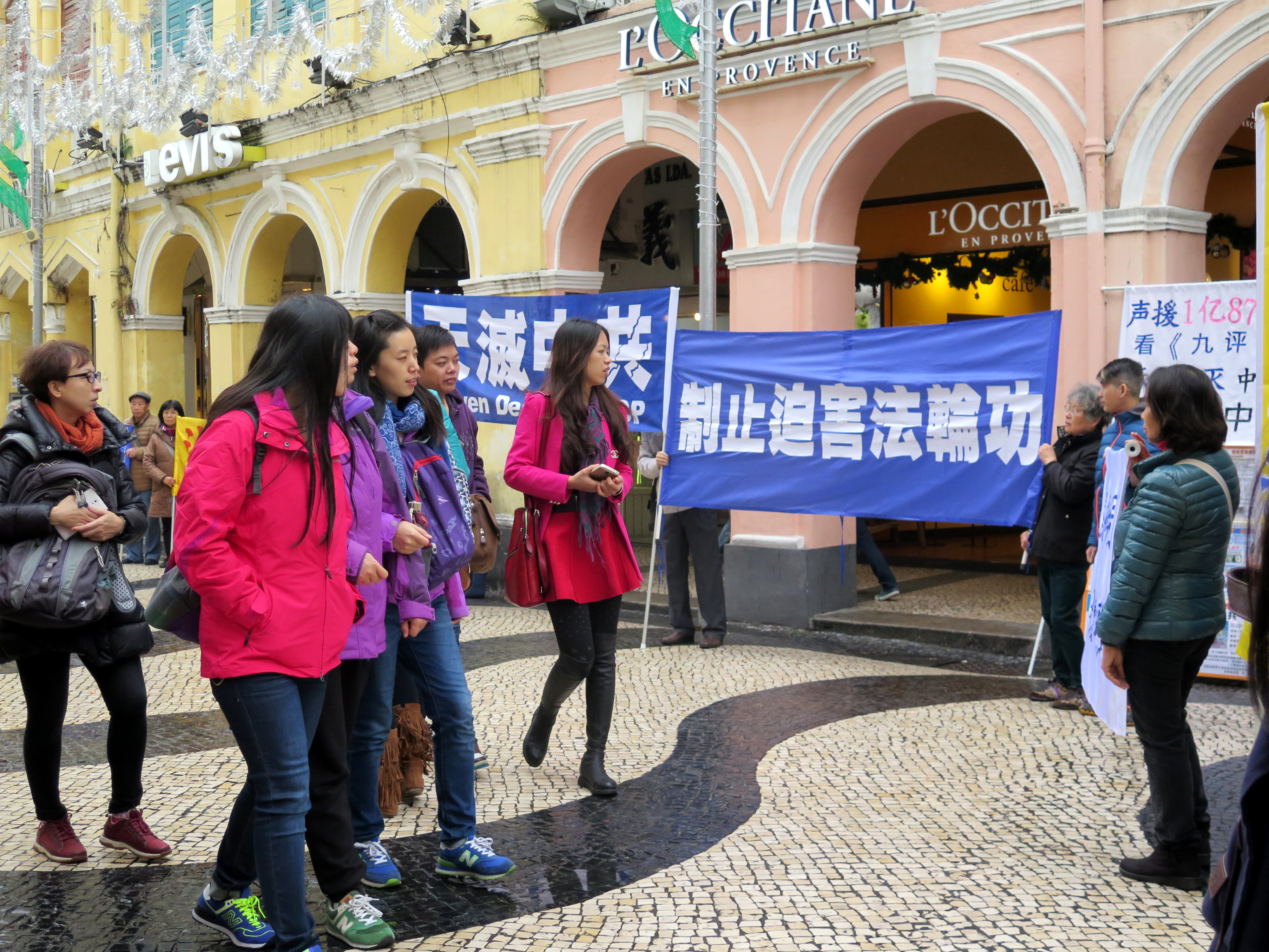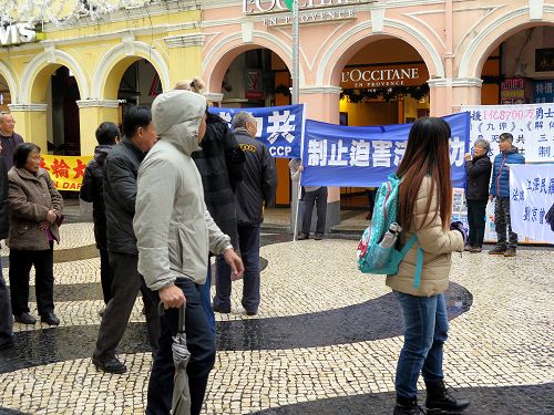 十九日早上,气温骤降,同时下着微微细雨。法轮功学员打出“法轮大法好”、“停止迫害法轮功”、“法办江泽民、周永康、罗干、刘京、曾庆红”、“天灭中共”等横幅,吸引不少澳门市民及游客驻足观看。