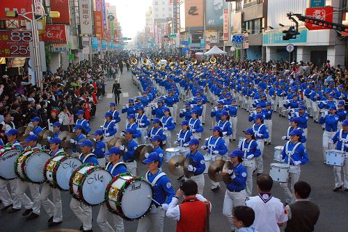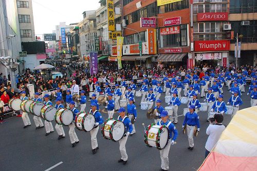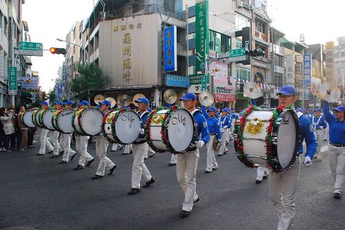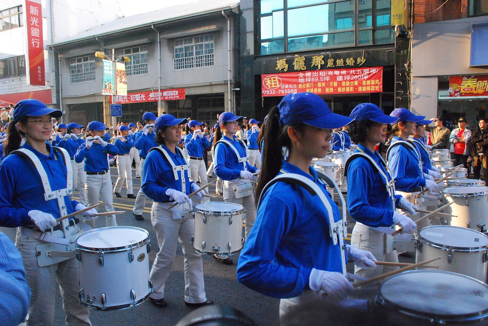 图1-5:由二百五十位法轮功学员组成的天国乐团参加了国际管乐节踩街演奏,壮观整齐的队伍赢得嘉义市民的热烈欢迎