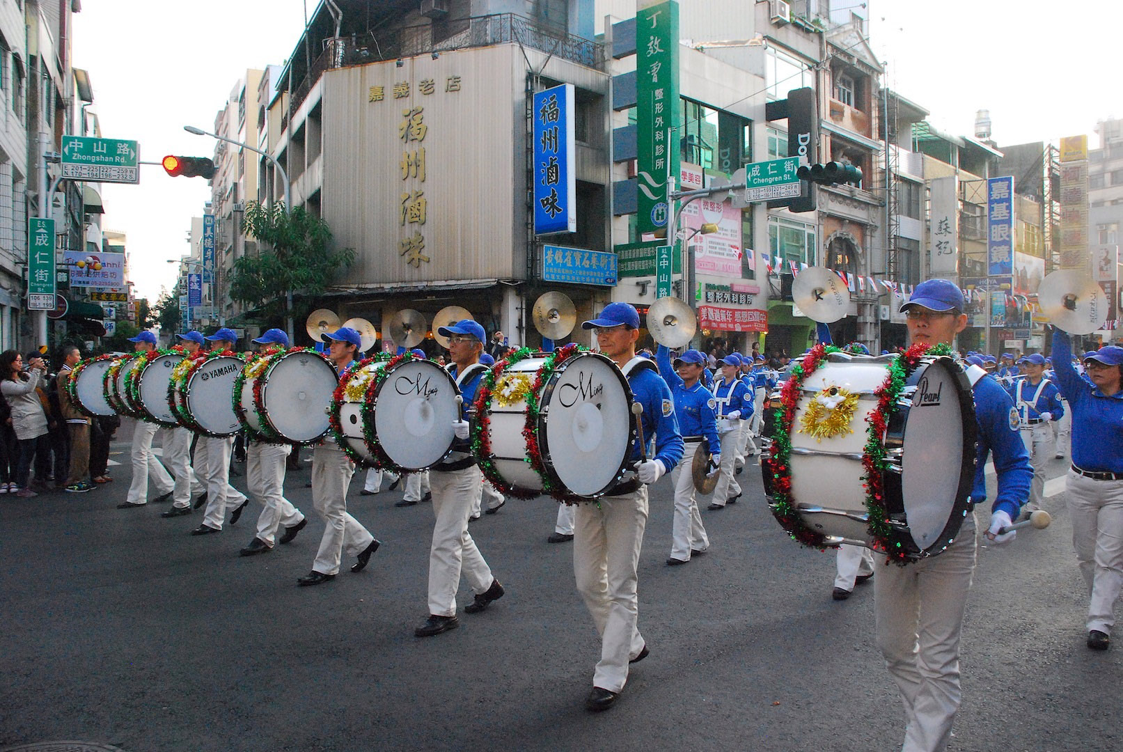 【明慧网二零一四年十二月二十二日】二零一四年十二月二十日,台湾法轮大法天国乐团踏上了嘉义街头,壮观整齐的队伍赢得嘉义市民的热烈欢呼,这是天国乐团连续第四年受邀参加国际管乐节踩街演奏。