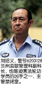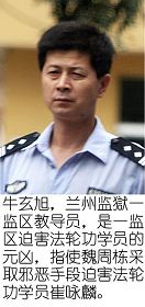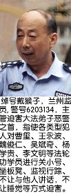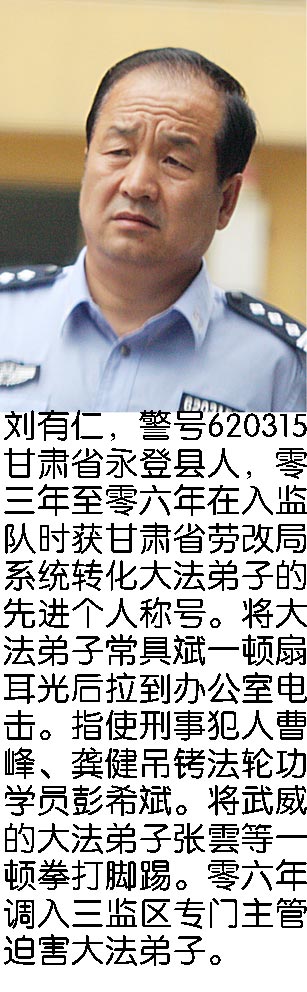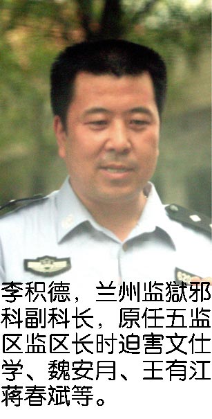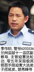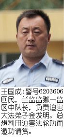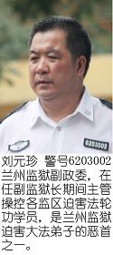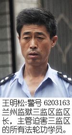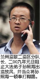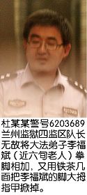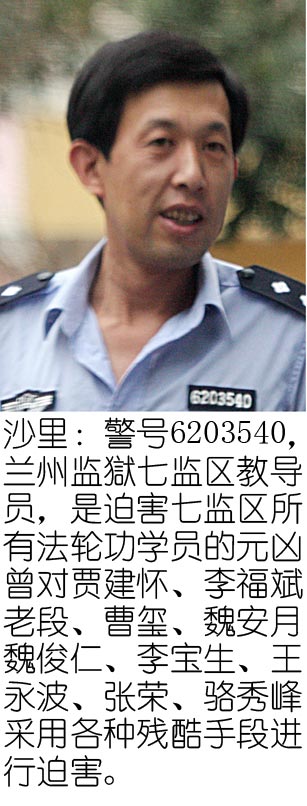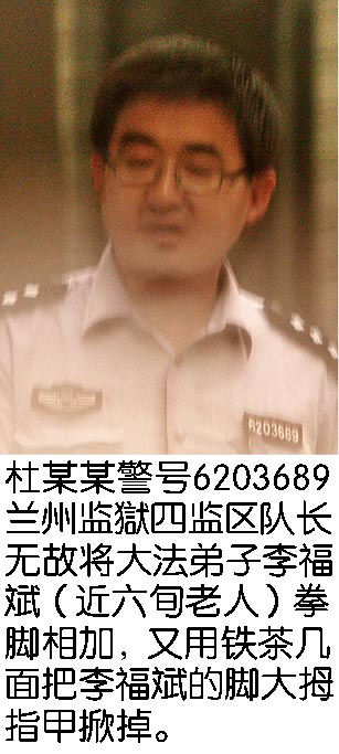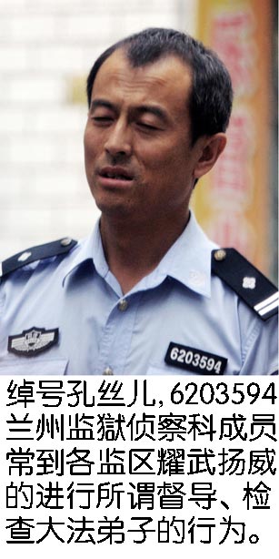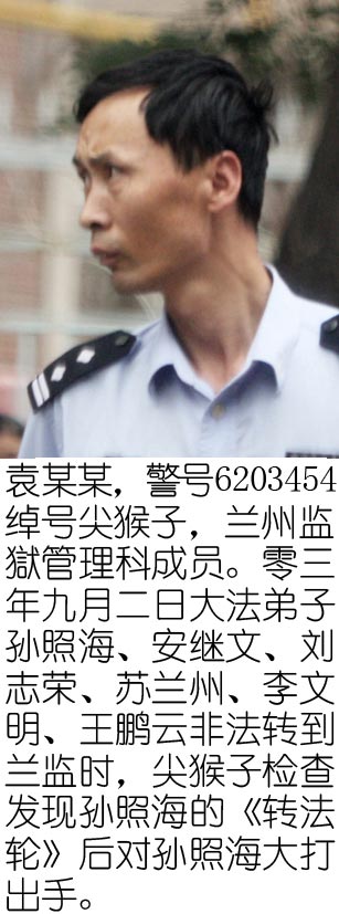 在兰州监狱,有一次警察搜出了王有江带的大法师父的经文,警察就指使四、五个犯人压倒王有江,抢走了经文,并将王有江的手和脚背后串在一起,又让犯人把被子蒙在王的头上,就这样两个多小时才放开。孙照海经常因不配合邪恶要求而被背铐,起蹲很吃力。