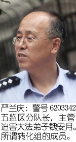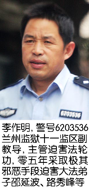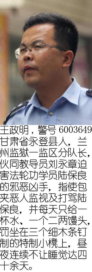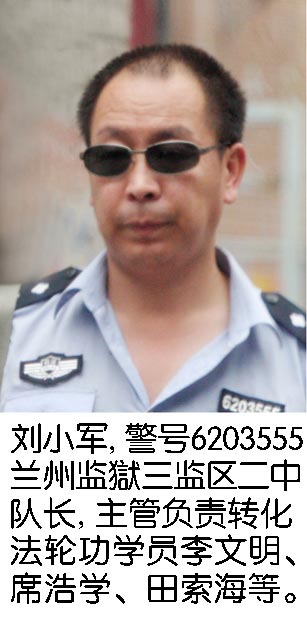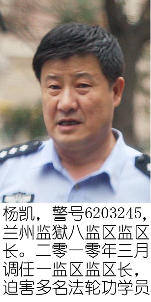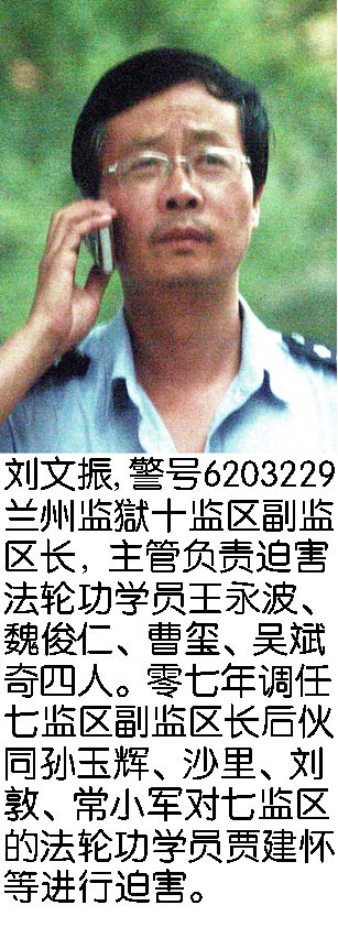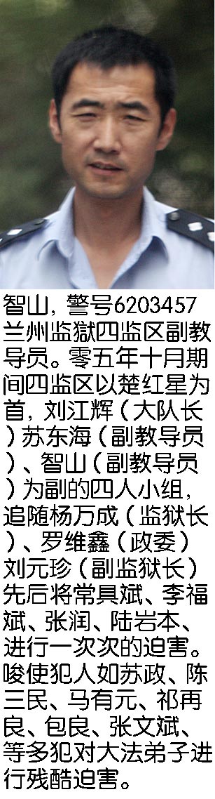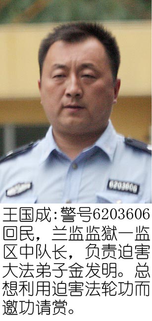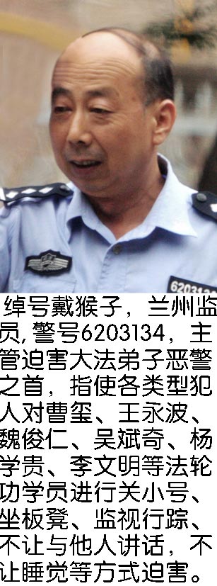 二零零五年底,兰州监狱对法轮功学员的严酷迫害疯狂到极点。监狱从各大队抽调专人负责落实对法轮功学员全面一个不落的所谓“转化”迫害。他们安排一个小号室,抽调主管队长以及其他警察组成一个所谓“帮教组”轮流值班,专门负责“转化”法轮功学员,晚上不许睡觉、打盹,直到天亮,再由负责白天的警察按班继续灌输大法不好为题的邪说谬论,到中午,警察去吃饭法轮功学员才能回到大号室就餐,休息一个小时。就是这一个小时,警察还安排了包夹法轮功学员的犯人把收音机开大音量,干扰法轮功学员。到下午两点钟警察上班,法轮功学员就又被关在小号室,继续接受“教育”到晚饭后,又由值夜班的警察按班继续进行迫害,周而复始,直到你屈服,写出邪恶要求的所谓“四书”,毁掉法轮功学员。更有甚者,对正信正念强的法轮功学员采用了吊铐、打骂、人身攻击,使用械具刑具等手段的迫害。二零一一年正月十三日之前,六监区警察王伟、何钦、杨建军等人不让白三元睡觉,对他实施“熬鹰”折磨,如迷糊,从脖子后颈处用拳打,弹眼珠;王明瑜抓住白三元的两个耳朵来回使劲摇晃。