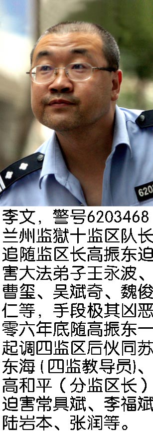 二零零三年元月吴秉奇被劫持到兰州监狱十大队迫害。在狱中,十大队教导员李文曾酷刑“转化”吴秉奇,把他关进禁闭室,双手用八号铁丝拧着扎住,整整关押了五十多天。吴秉奇从禁闭室出来后,又被铐在院中的水泥电杆上暴晒,晚上铐在床架上,不让睡觉。