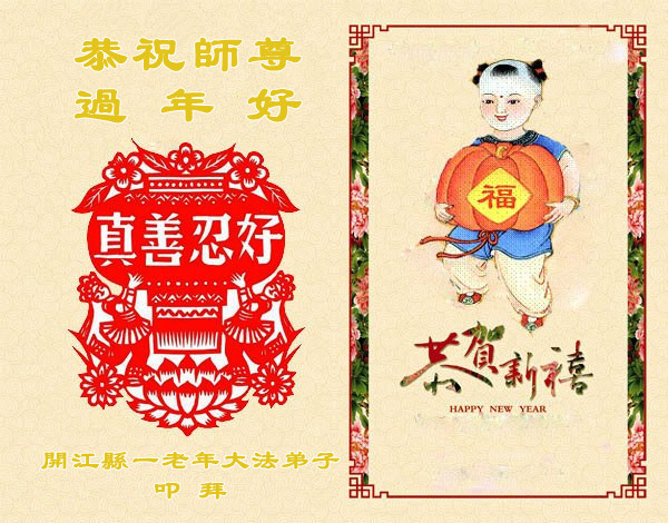河北保定一位八旬老人祝李大师新年快乐,并感谢李大师的保护:“我曾受多种病痛折磨,诚念‘法轮大法好,真善忍好’,病痛消除。现在我满屋贴的都是法轮大法的年画、图片、年历。愿大法早日平反、昭雪,愿李大师早日回国。”