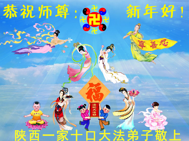 四川德阳一位商人携家人恭祝李大师新年快乐:“我们虽还没修炼,但我见证了父亲零六年瘫痪后,大法在他身上展现的神奇——他能走能动了,血压正常,血糖正常,医生都说是奇迹。我开快餐店,坚持用真相币,也向真、善、忍看齐,做良心商人,不用地沟油,不买两元一斤的瘤子肉,不以次充好。我们感谢大法师父,知道修大法的人都是世上最好的人,都支持法轮功!”