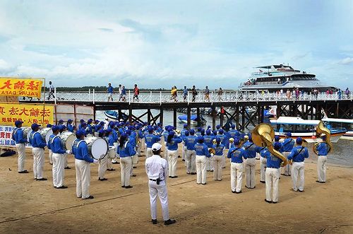 二零一四年一月三十一日,中国新年,一艘游船从努萨班尼达岛载回几百名中国游客,停靠在码头。由法轮功学员组成的巴厘岛天国乐团奏起音乐,同时举起真相横幅,迎接中国游客。
