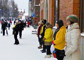 二月一日,瑞典北方城市于默奥(Umeå)正式成为二零一四年欧洲文化首都,连续三天举办庆典活动,大约八到十万人次参加。当地法轮功学员也藉此机会来到这里弘法,让更多各界人士了解法轮功的真相。