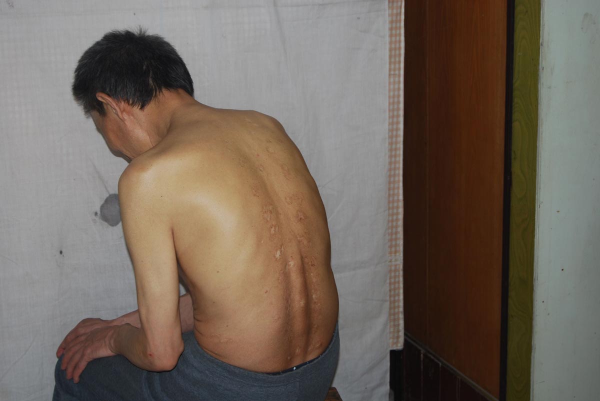 朱庆江对我讲,你哪条腿痛?我用手指着左腿说就这条。刚说完,高帅手持腊棍冲了上来,照我的髋骨关节抡起腊木毒打不止,然后高帅又猛地一脚把我蹬出几米远倒在地。又是一阵乱棍毒打。朱庆江说,还打屁股起作用,然后又令新犯扒下我的裤子,用腊木击打已打烂的屁股,打得我全身找不出一块完整的皮肤,最惨的是两侧屁股一直在流着血,两侧肋骨也是先流血后发了炎,两手指缝也是先流血后发炎化了脓。我一天到晚不敢坐,也不敢躺,只能站着,我多次要求朱庆江领我去医院包扎伤口,朱庆江都以“政府”没在,或没批准而推之。每天上厕所,脱内裤就会粘下一层皮肉。