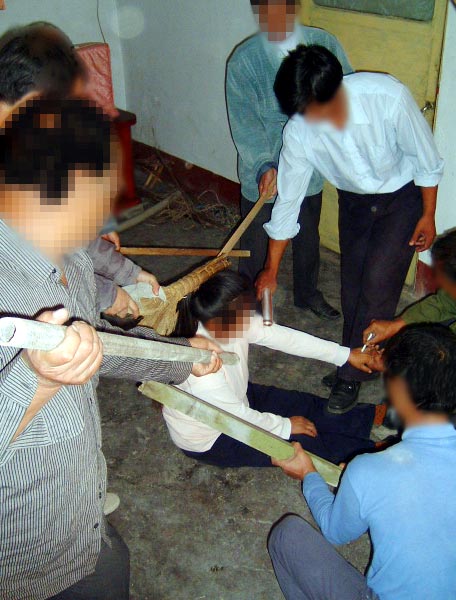 二零零三年九月,张艳芳因炼功被恶警张春华、郑杰(队长)强迫进行非人拉练,犯人赵艳一脚把张艳芳前牙踢掉。白天把张艳芳拉到没人地方,恶警、恶人围成一圈让跑步,不跑就打,到谁那,谁就用小白龙或电棍或警棍打。晚上不让她睡觉,恶人王凤春、王威、朱玉红、李桂香用木棍打脸,把裤子扒下,用木棍毒打至少一百多下。张艳芳的脸和身体被打的紫青,恶徒们还要用盐水擦洗她的身体,侮辱打骂。