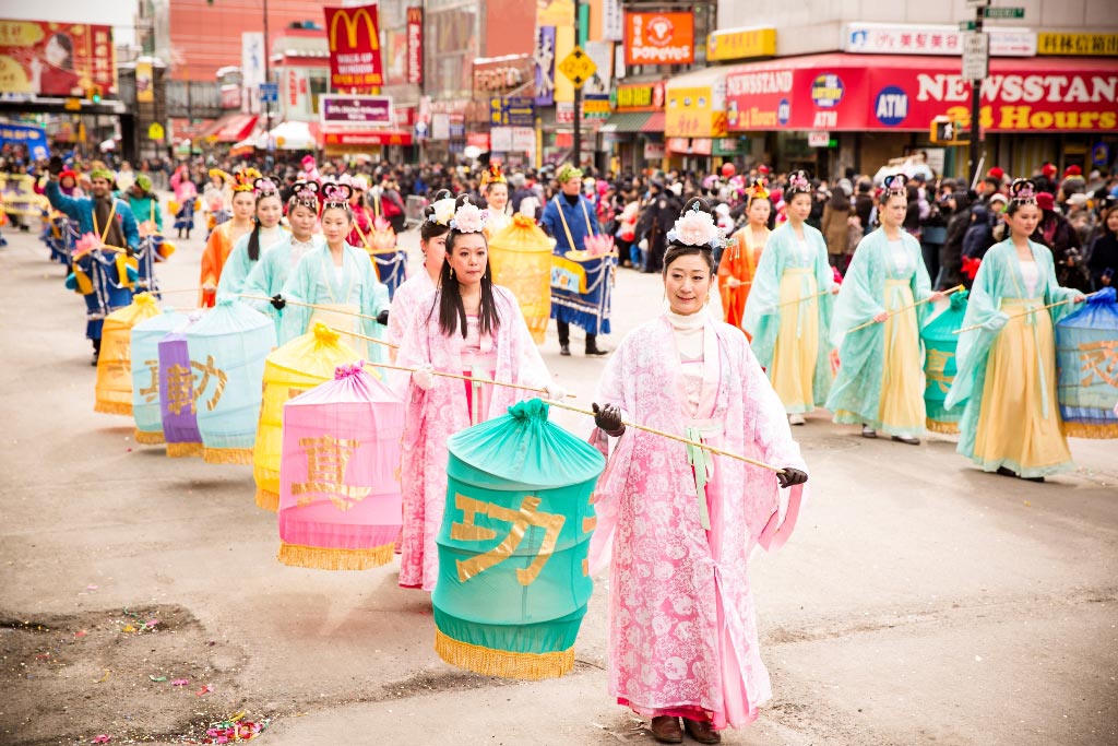 【明慧网二零一四年二月九日】(明慧记者采菊纽约报道)二零一四年二月八日,年初九,纽约法拉盛街头鼓乐喧天,街道两旁大人小孩翘首以待一年一次的游行队伍,庆祝甲午年的到来。法轮功队伍以其俯仰天地的正气,昂扬雄浑的乐曲,丰富多彩的贺岁,博得了民众的热烈欢迎。所到之处,人们纷纷拍照,录像,表达喜悦之情。正是“佛光普照,惠及万物”。