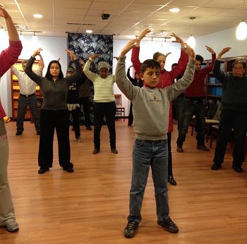 唐纳德年已七旬,瘦瘦的身量,身体比较僵硬,特别是肩膀和后背。九讲班的第五天正逢星期六,天梯书店上午为新学员举办一小时的集体炼功活动。唐纳德参加了。对新学员来说,第二套功法炼十二分钟都很漫长,他却默默的跟着大家坚持做完了三十分钟,并且认真的继续炼第三套功法。“修在自己,功在师父”[1]。也许诚意可嘉,当第三套功法做到第三遍时,他原本只能抬到与地面成三十度的手臂,竟然能举到耳边了,难度不小的“两侧抱轮”也做的相当到位。