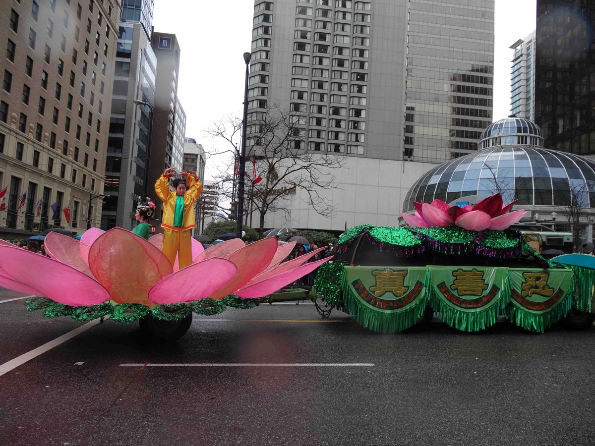 温哥华法轮功学员的腰鼓队和花车应邀参加了游行,受到沿途中西观众的欢迎。队伍经过时,不少观众拿出照相机或用手机拍照留念。
