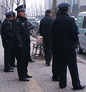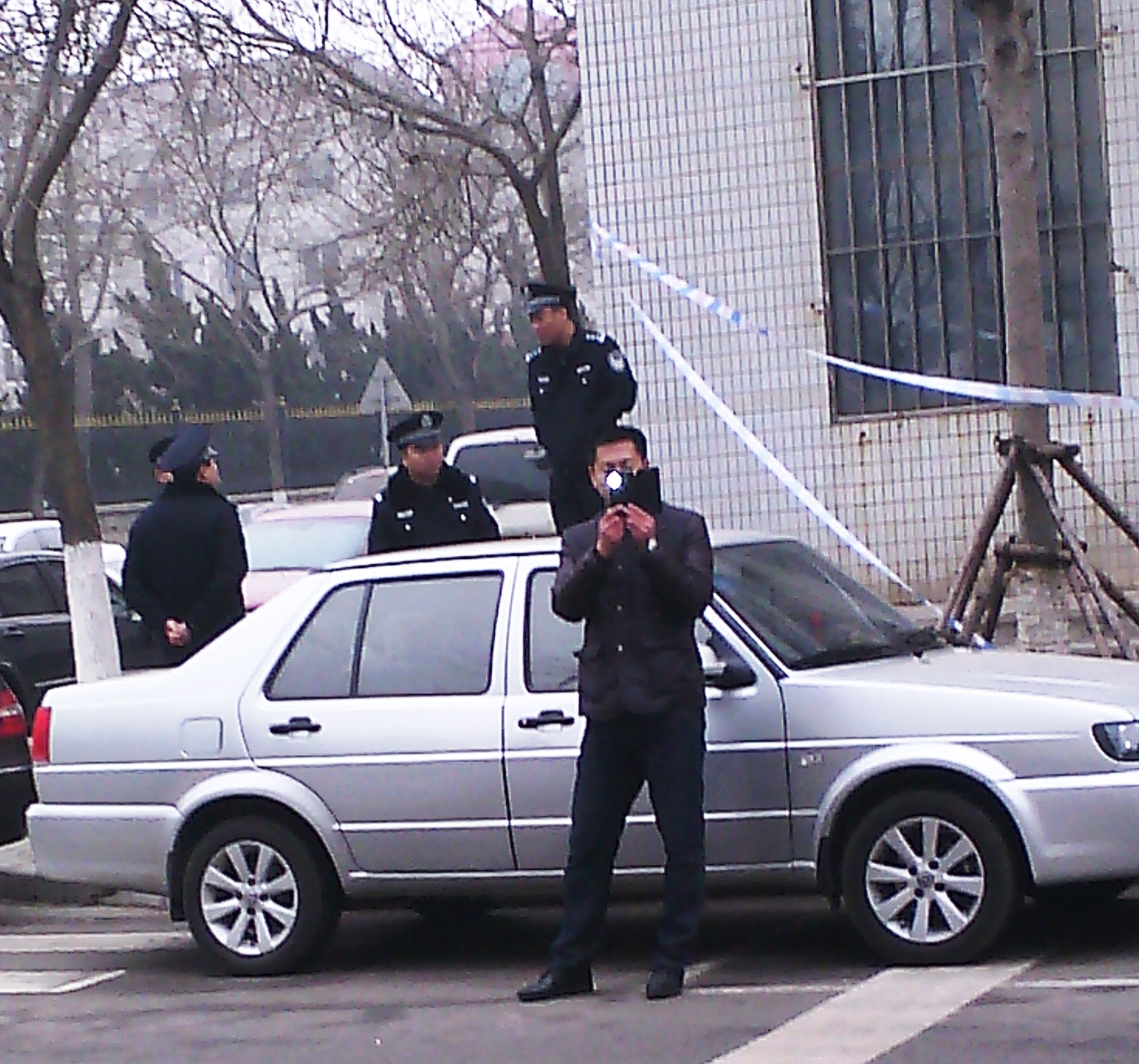 ![]() 法警拦着不让夏元新的妻子和女儿进去旁听。 |