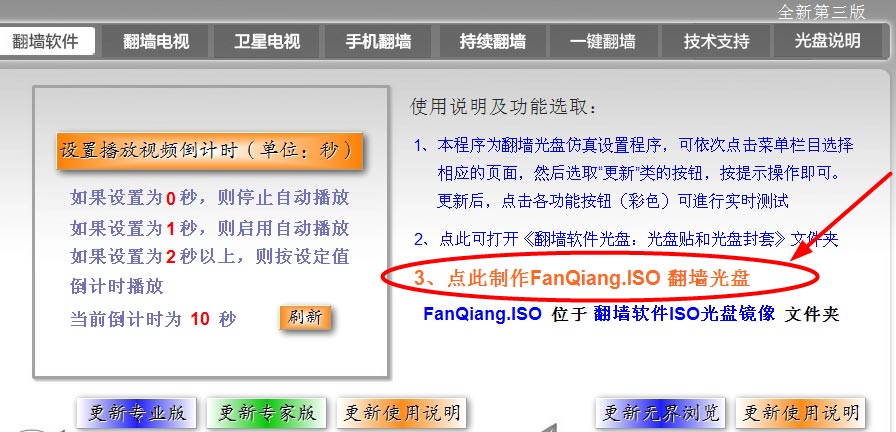 下载附件解压缩后,刻录光盘之前请点击其中的“更新与设置.EXE”文件,在出现的界面中可直接生成用于刻录光盘的镜像文件FanQiang.ISO,然后按照刻录镜像的方式刻录即可。