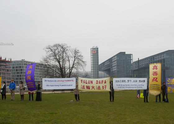 三月二十八日,在习近平访问德国柏林期间,法轮功学员在他走访的德国总统府和总理府前举办和平抗议活动,要求制止对法轮功的迫害,立即法办迫害法轮功的元凶江泽民、罗干、周永康和刘京等。