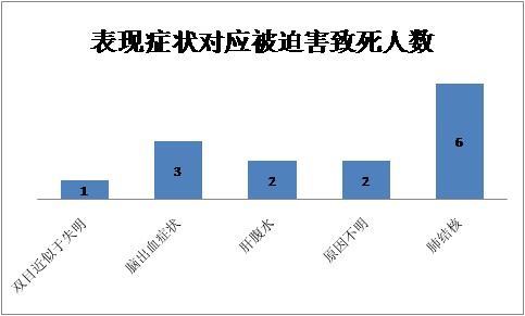 肺结核症状迫害致死的六人,肝腹水症状二人,脑出血症状三人,双目近似于失明一人,原因不明二人。