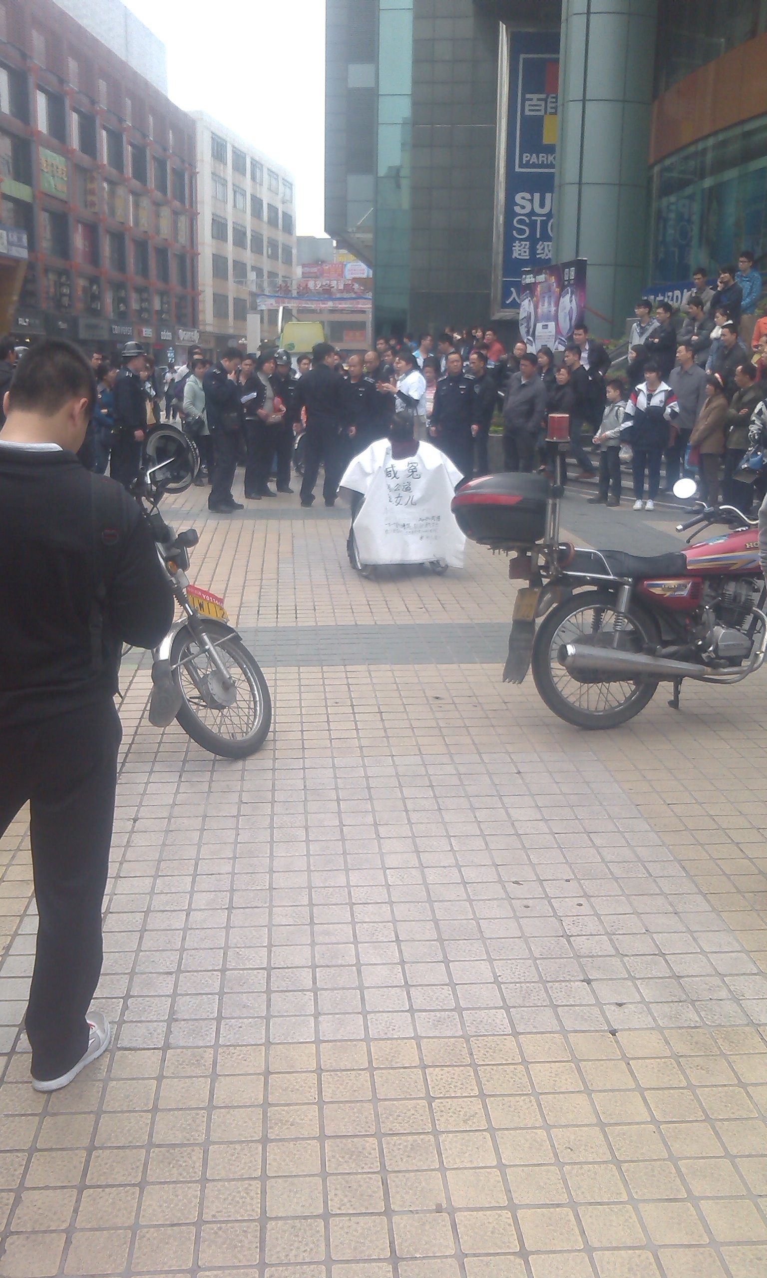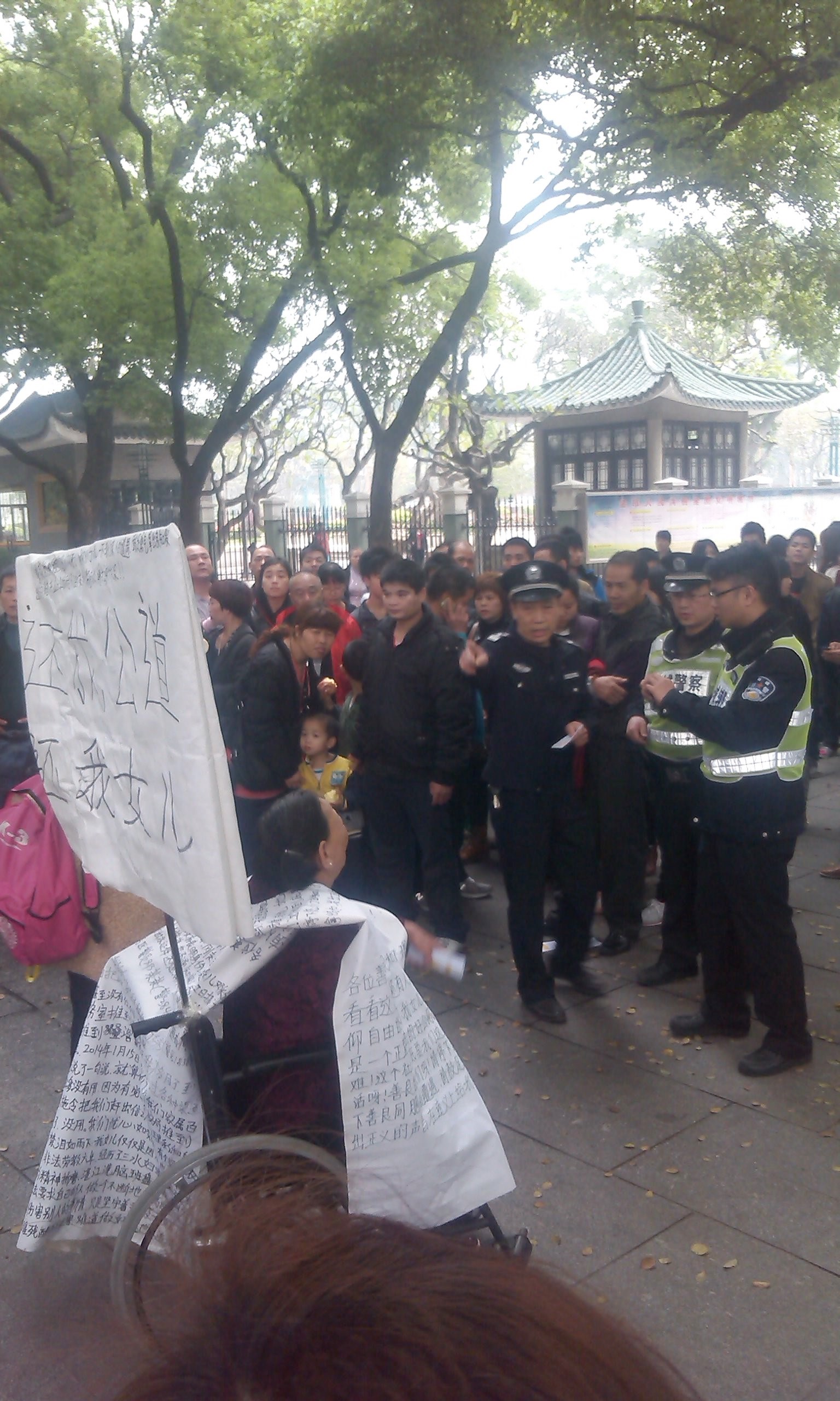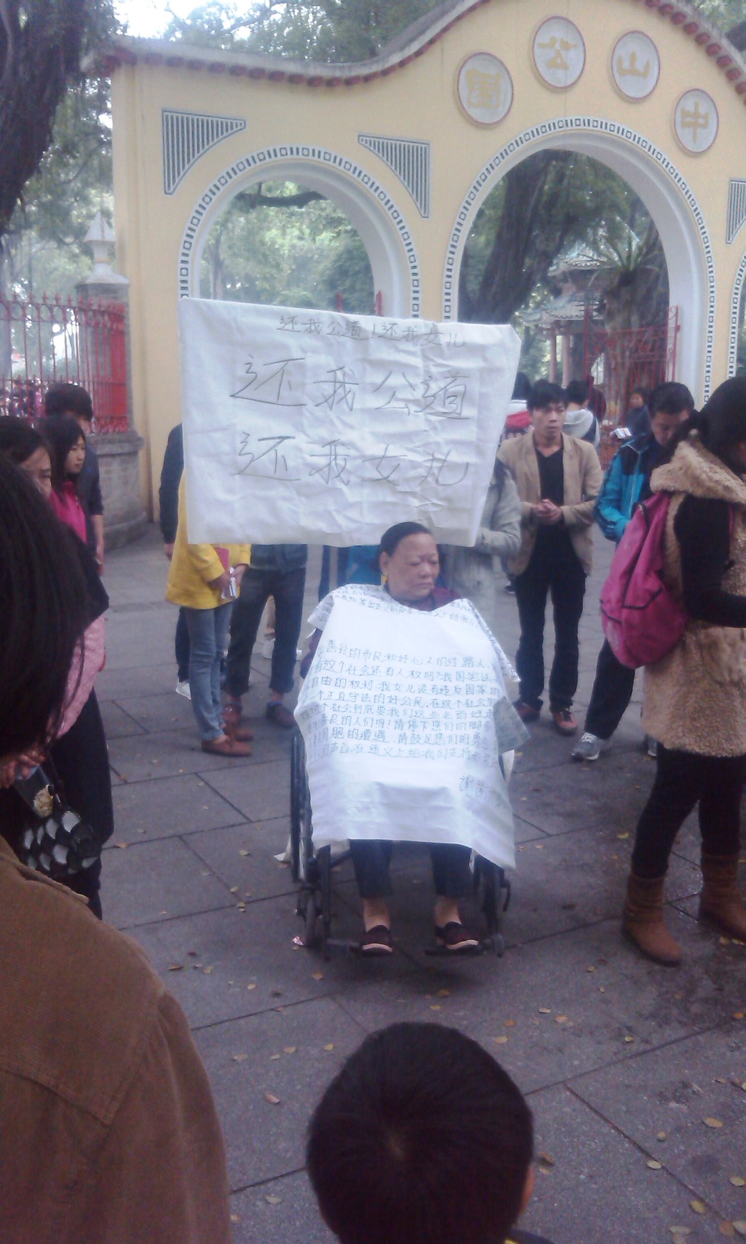 邓彩娟的母亲为了为女儿讨回公道,二零一四年三月十六日拖着体弱多病的身躯,坐着轮椅(下图),在佛山市中山公园门前向路人诉冤,遭到警察骚扰。