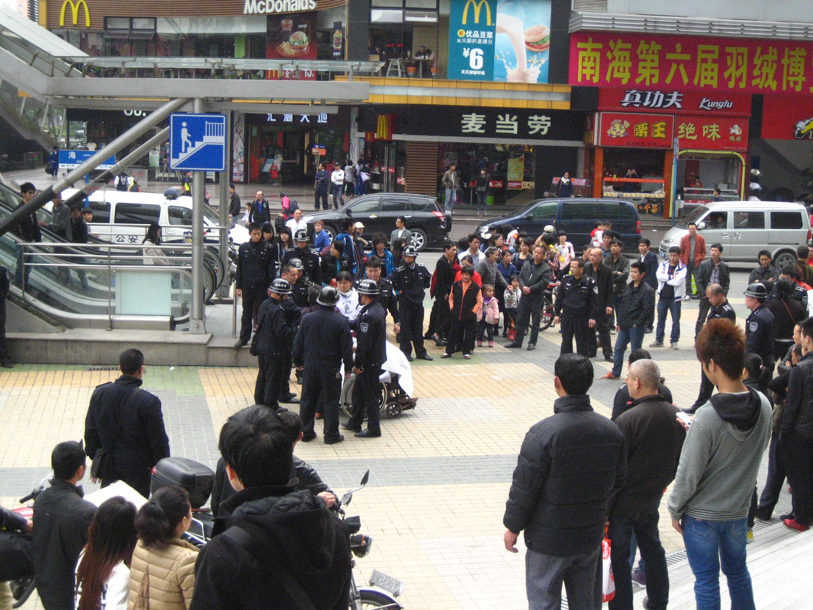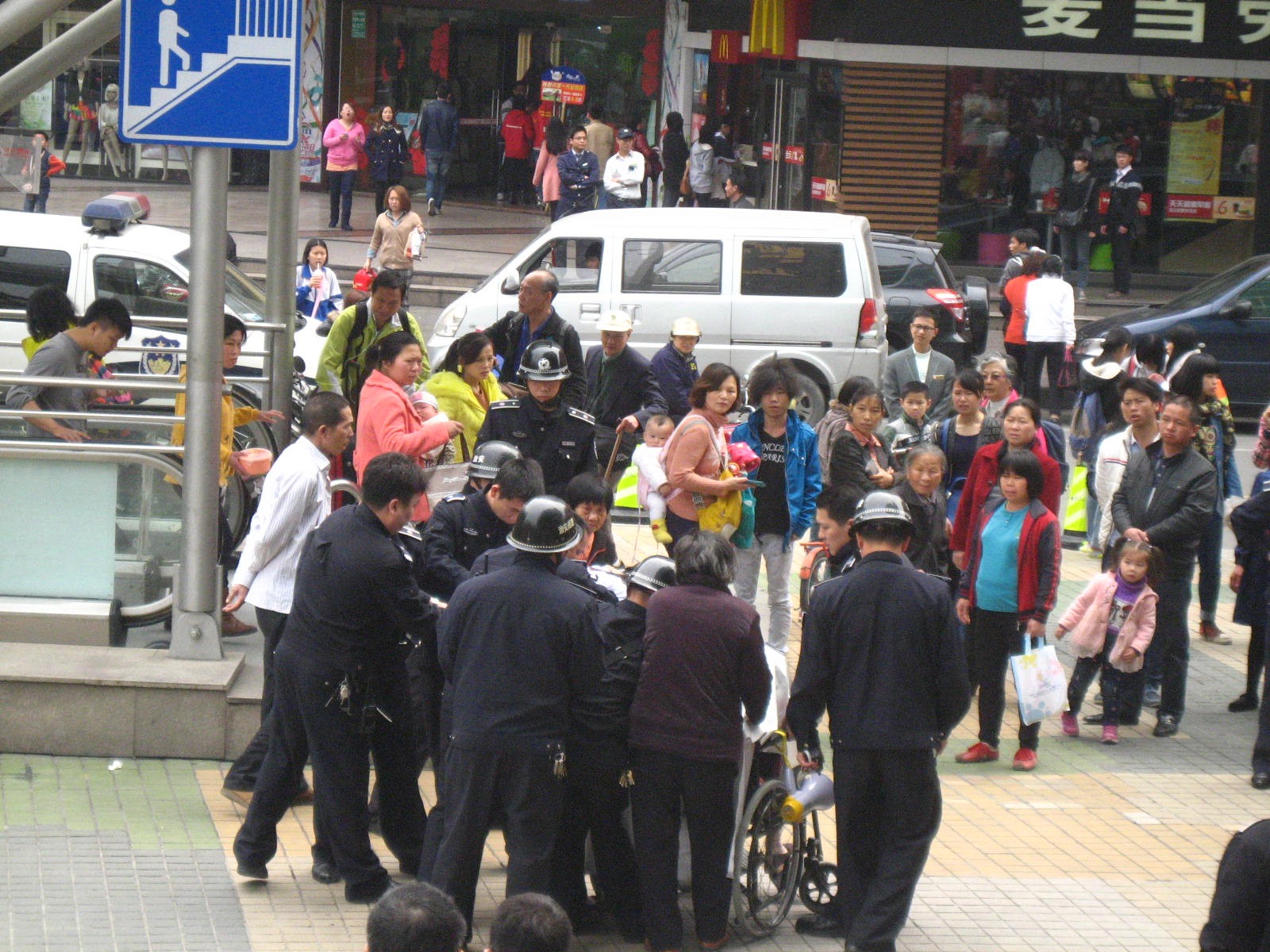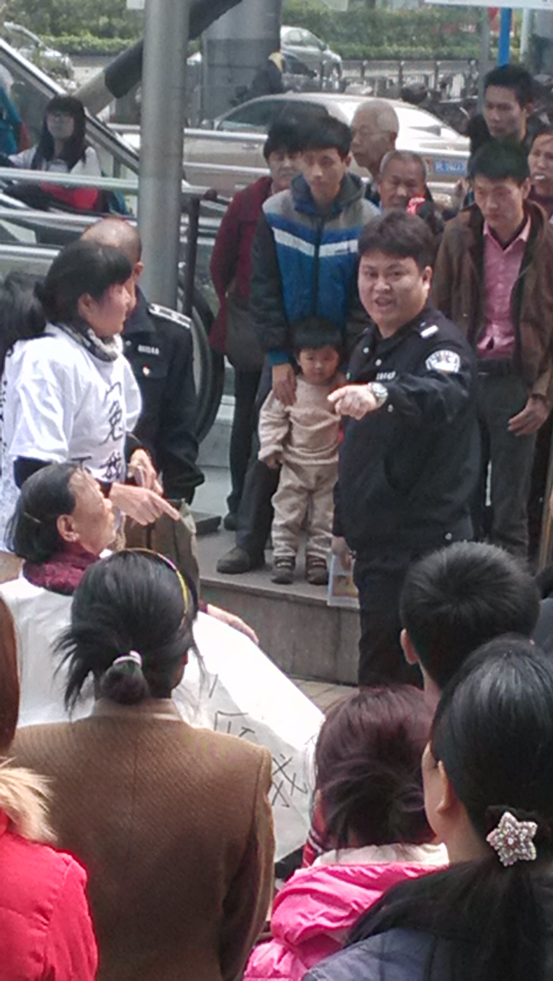 三月二十二日,阿娟的母亲在得不到有关部门的答复后,再次坐上轮椅,让儿媳谢瑞香推她到佛山市南海区桂城南海广场。当时正是中午时分,广场上人来人往,老人家坐在轮椅上,一边向路人讲述邓彩娟近期被无故迫害的遭遇,一边派发阿娟多年来所受到多次残酷迫害的申诉资料。人们了解了真相后,都很同情老人家,纷纷谴责中共邪党恶警的暴行。