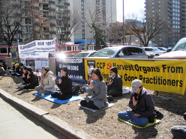 图1:卡尔加里法轮功学员在中领馆前抗议
