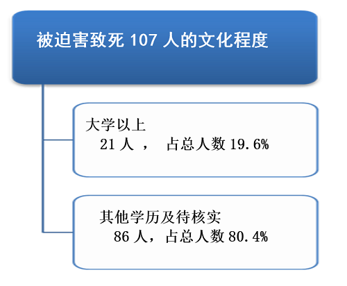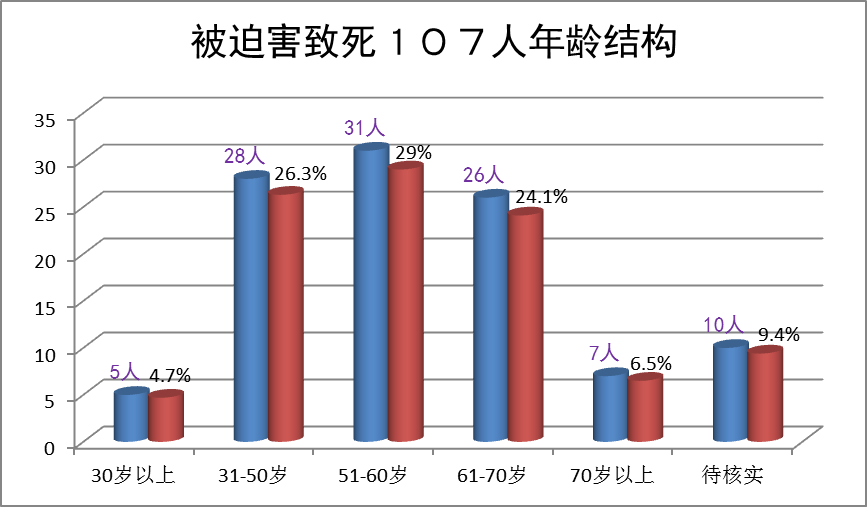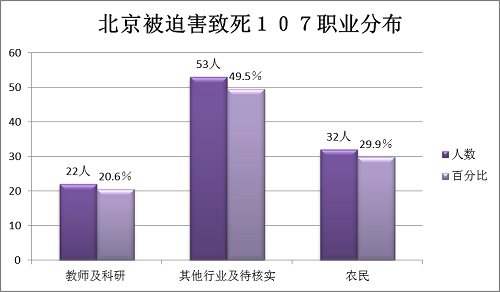 自2000年1月15日发生的北京地区第一例被迫害致死的法轮功学员张淑琪(西城区),至2013年10月1日被迫害致死的李跃进(石景山区)的107人中,年龄分别在20多岁至80多岁(最高龄为81岁),职业分布在教育、科研、卫生、工人、农民等各行业;文化有大学及大学以上学历的高知,也有中小学及文盲;有在职人员,也有退休老人;地域分布在全市16个区县,人数最多的是朝阳区,17人,其次为密云县16人。