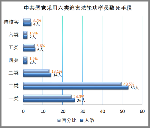 必须指出的是,以上被迫害致死的人数只是实际人数中的一小部份,自1999年7月之后,北京有多少法轮功学员被迫害离世,还有待于进一步调查核实。法轮大法明慧网揭露的迫害事实,主要是在监狱、劳教所、拘留所、看守所、派出所、洗脑班等黑窝里遭受的迫害,因此在此统计中,第一类、第二类被迫害致死的人数占绝大多数。