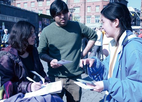 很多人都听说过法轮功无辜遭受中共迫害的情况,他们踊跃签名反迫害。也有的人原来没听说过法轮功,通过这个机缘,他们了解了法轮功是以“真、善、忍”为原则的修炼功法,在过去十几年中一直遭受中共的残酷迫害。除了丹麦人,路过广场的还有好些是其它国家的游客,瑞典、德国、荷兰、挪威,还有在丹麦居住的尼泊尔人等。不少人被优美的法轮功功法吸引,现场学炼起来。