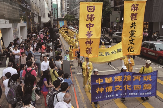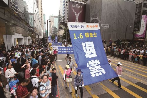 ![]() 图13-14. 遊行队伍的横幅真相触动人心,许多大陆遊客把握机会办理三退(退出中共党、团、队等组织)。 |