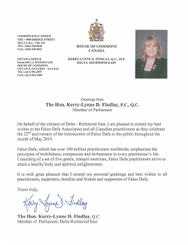 日前,加拿大众议院三角洲-列治文东(DELTA-RICHMOND EAST)国会议员克里琳恩-芬德利(Kerry-Lynne D.Findlay,Q.C.,M.P.)发来贺信,祝贺法轮大法弘传二十二周年。