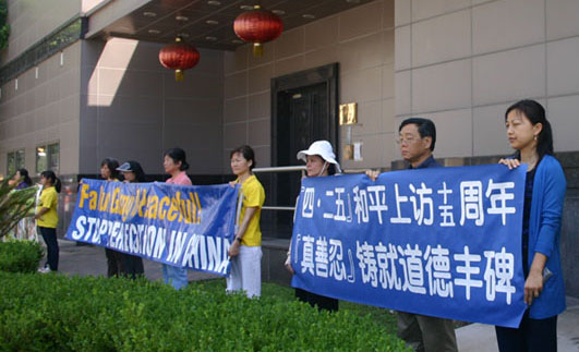 法轮功学员宋先生表示: “一九九九年四月二十五日,法轮功学员在北京国务院信访办理性上访,要求政府放人(天津非法抓捕了法轮功学员), 要求给法轮功学员一个宽松修炼的环境。九九年七月全国范围的迫害开始,至今仍在持续。即使面对这样残酷的打压,十多年来,法轮功学员坚持不懈向民众讲真相的努力一直都没有动摇。今天是纪念四•二五的特别日子,我们更是要传播真相。”