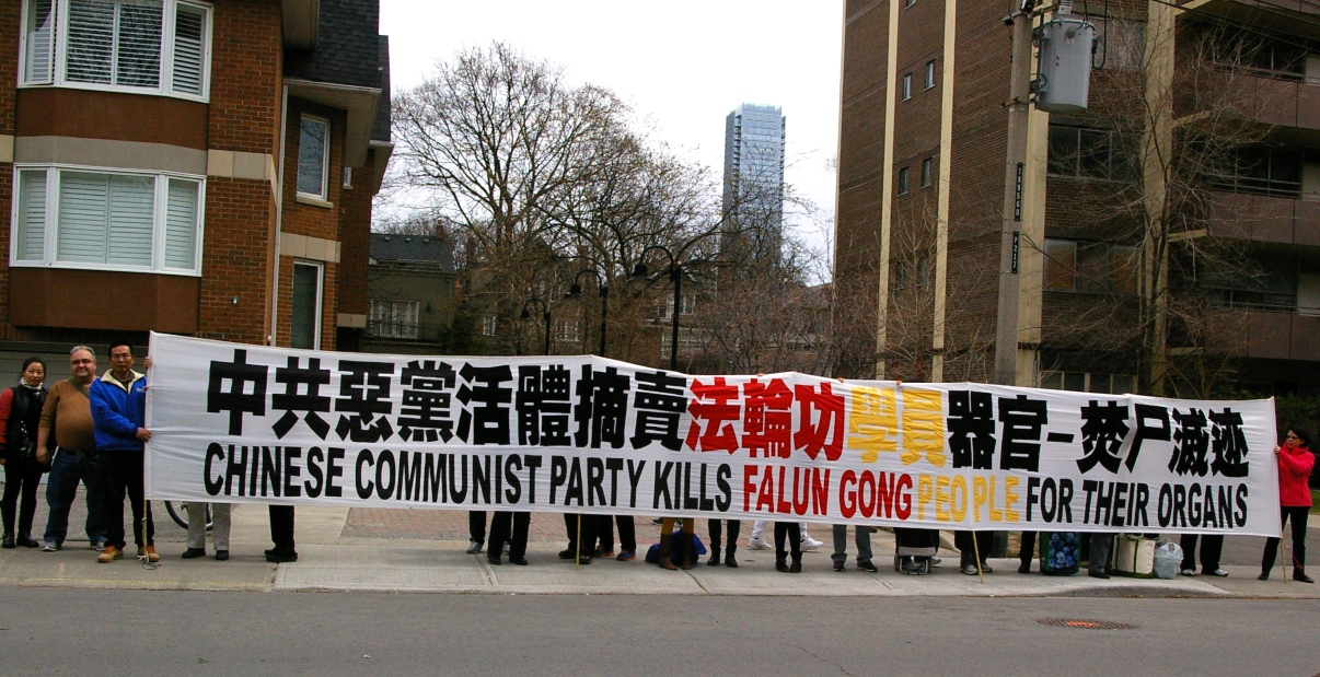 下午四点至六点,虽然天下着雨,学员们还是在中领馆附近的大学街(University)和布鲁街(Bloor)路口拉起横幅,筑起真相长城给路人讲真相,并举行“制止中共活体摘取法轮功学员器官”的征签活动。