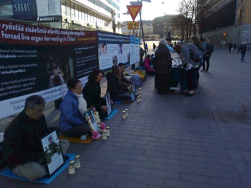 下午学员们又来到首都赫尔辛基火车站旁,举行神圣的烛光守夜,悼念三千多名被中共迫害致死的法轮功学员。活动现场,学员们向世人演示法轮功五套功法纯正的能量场、在祥和的悼念音乐下,吸引了一波一波路人驻足高度关注和签名支持反迫害。